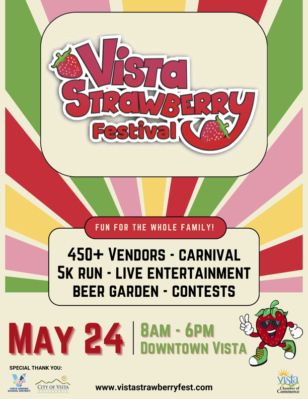 Celebrate a berry sweet day at the Vista Strawberry Festival! 🍓 Join us on May 24 from 8am-6pm in Downtown Vista for family-friendly fun featuring 450+ vendors, a lively carnival, a 5K run, live entertainment, a beer garden, and exciting contests! There’s something for everyone so don’t miss one of the community’s most delicious celebrations!